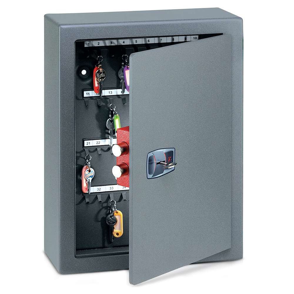 •biztonsági kulcsszekrény•szimplafalú test 3 mm-es acélból•megerősített ajtó, 8 mm-es acél borítással•90 fokos ajtónyitás rejtett zsanérokkal•egyirányú zárás 22 mm-es acél hevederekkel•felfúrás ellen mangán acéllappal védett zárszerkezet•8 lamellás duplatollú biztonsági zár•kettő darab kulcs, kódkártyával•számozott, fém kulcsakasztók•négy rögzítő furat hátrafelé