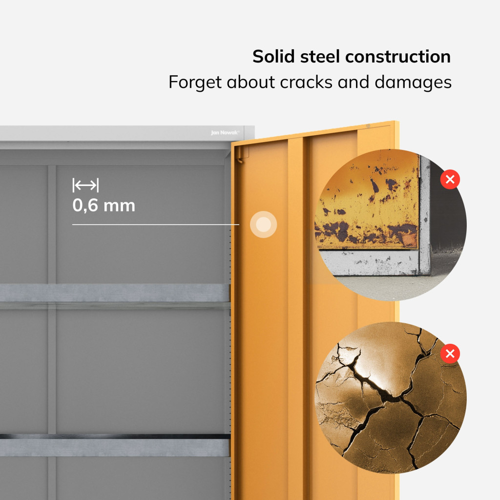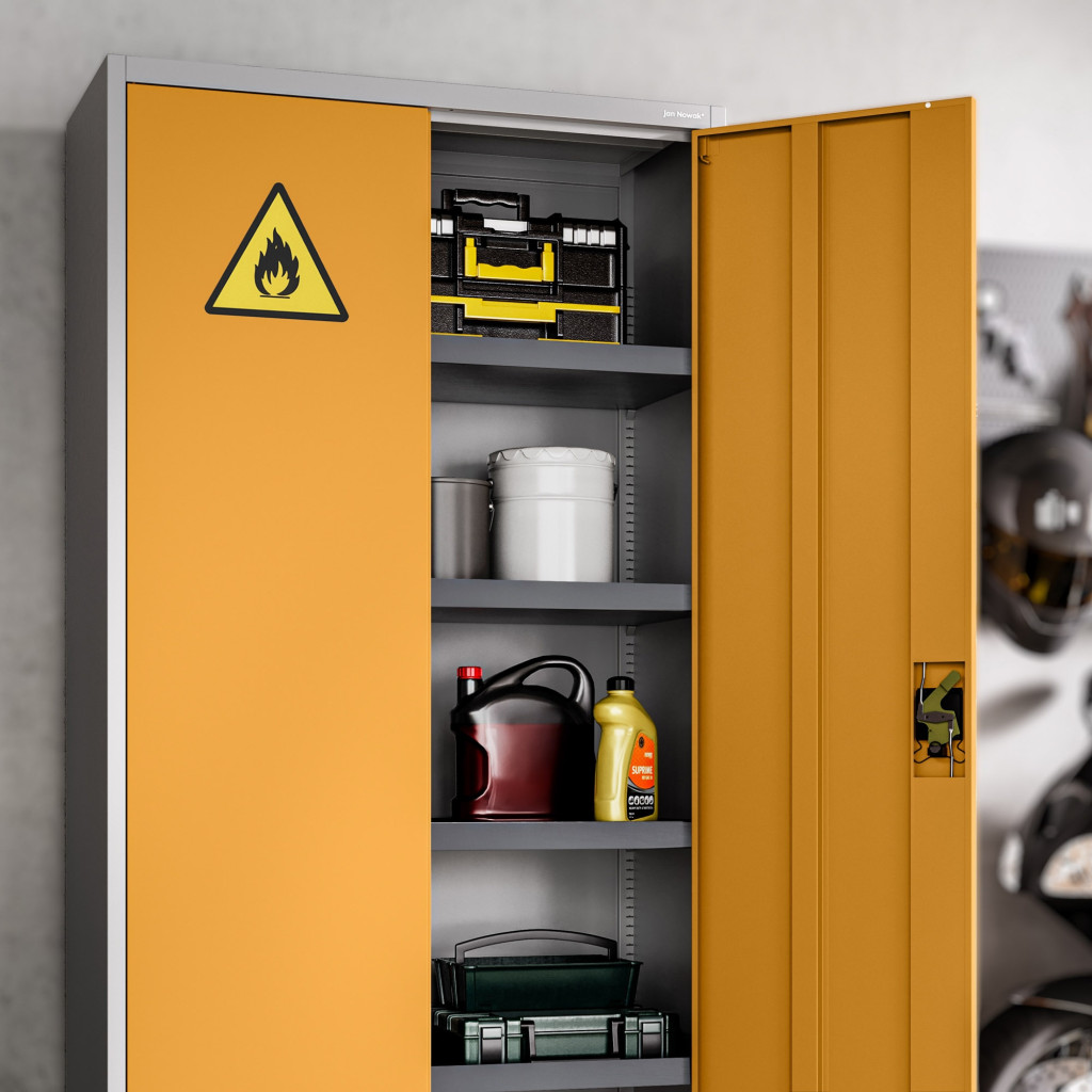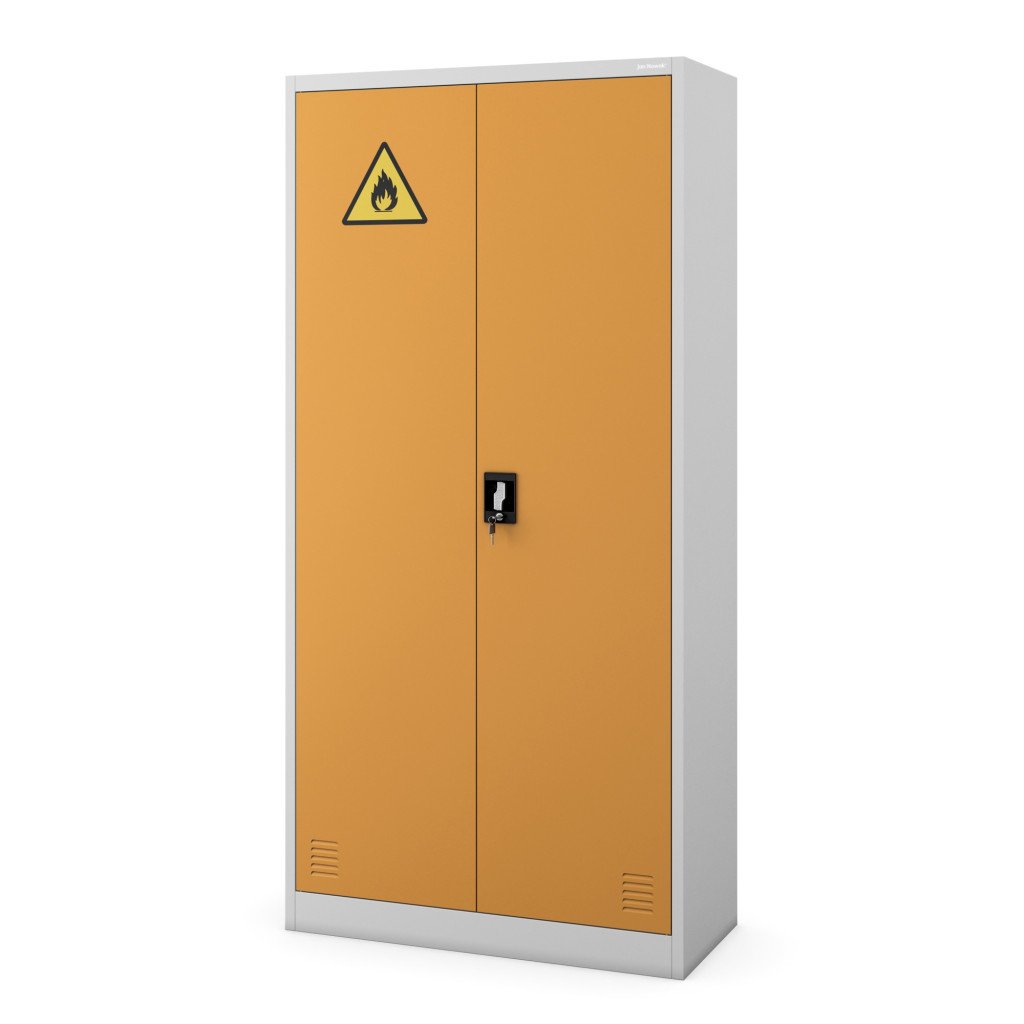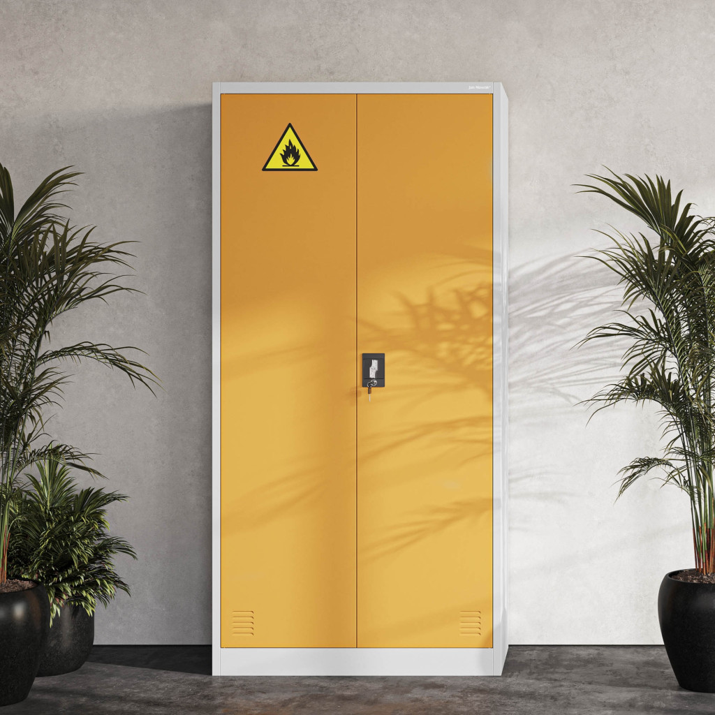 A MARIA vegyszerszekrény a modern ipari tárolás egyik legmegbízhatóbb eszköze, amelyet kifejezetten a veszélyes anyagok és maró vegyszerek szakszerű elhelyezésére terveztek. Ez a robusztus acélszerkezet 0,6 mm vastagságú lemezből készül, amelynek felületét speciális vegyszerálló és korróziógátló bevonattal látták el, így a szerkezet még intenzív használat mellett is hosszú ideig megőrzi épségét. A szekrény impozáns 1850 mm magasság mellett 900 mm szélesség és 400 mm mélység paraméterekkel rendelkezik, így jelentős tárolókapacitást biztosít. A feltűnő szürke és sárga színkombináció azonnal felhívja a figyelmet a tárolt anyagok veszélyességére a műhelyekben vagy iskolákban, miközben az egység 44,50 kg súlya garantálja a stabilitást.
