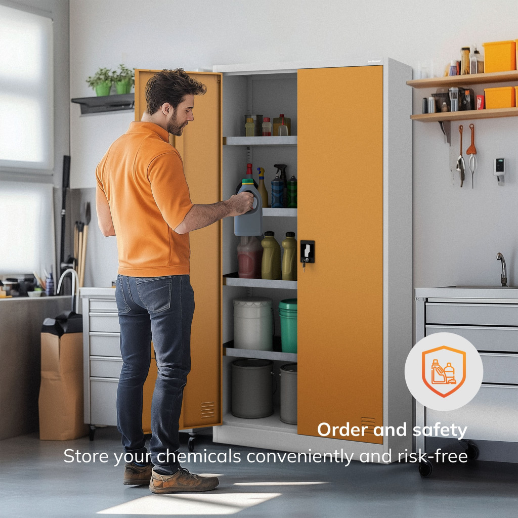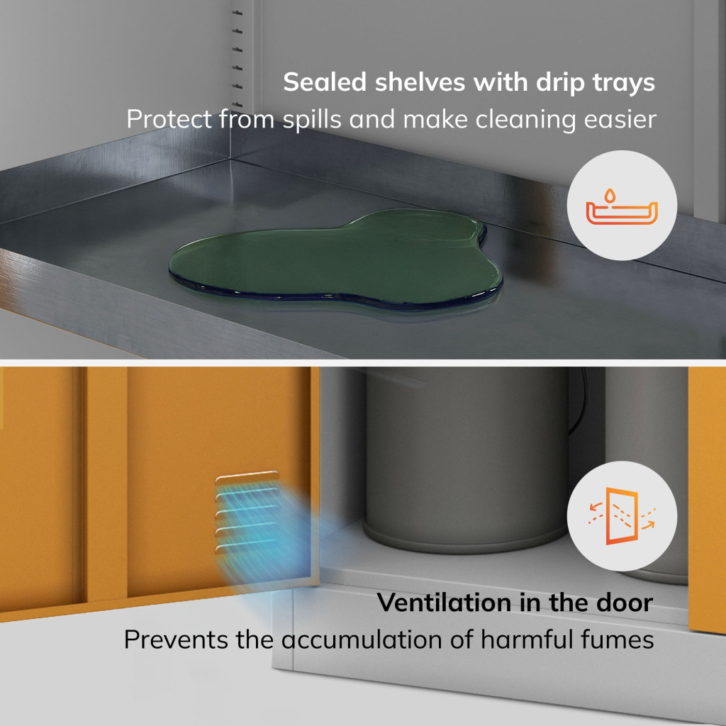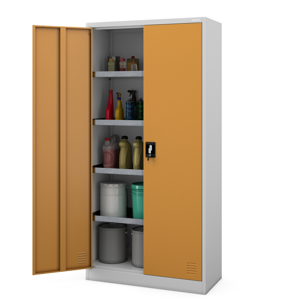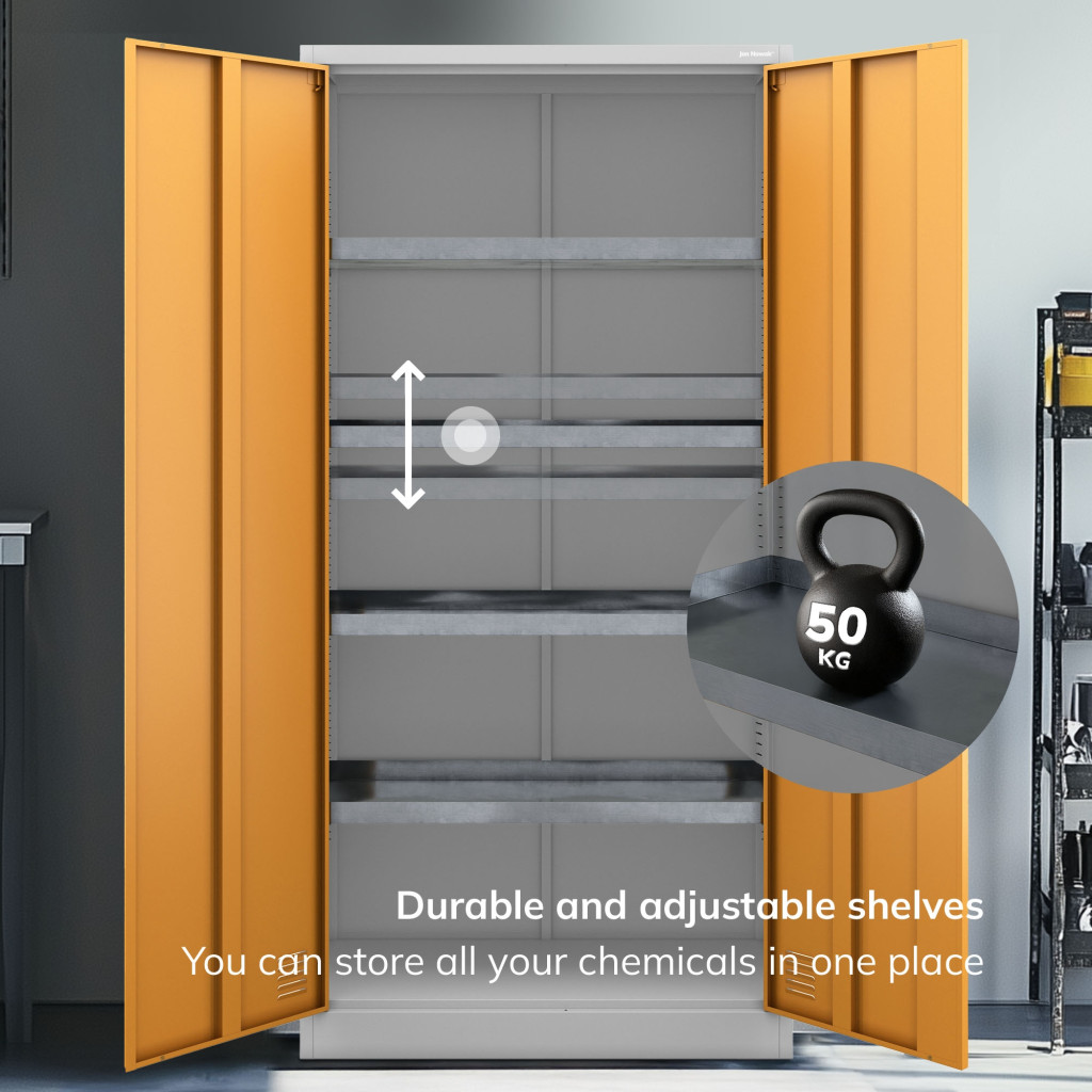 A belső kialakítás során a legfontosabb szempont a környezet védelme volt, ezért a szekrényben 4 darab állítható magasságú polc található, amelyek mindegyike speciális szivárgásmentes és kifolyásgátló tálcával van felszerelve. Ez a megoldás garantálja, hogy egy esetlegesen sérült tárolóedényből kiömlő folyadék ne juthasson ki a szekrényből. A polcok teherbírása egyenként 50 kg, ami lehetővé teszi a nehezebb ipari kiszerelésű vegyszerek biztonságos elhelyezését is. A termék lapraszerelt kivitelben érkezik és összeszerelést igényel, de a pontos illesztéseknek köszönhetően a folyamat egyszerű.