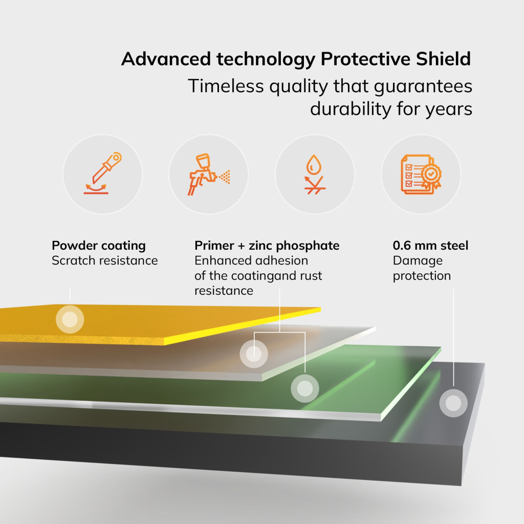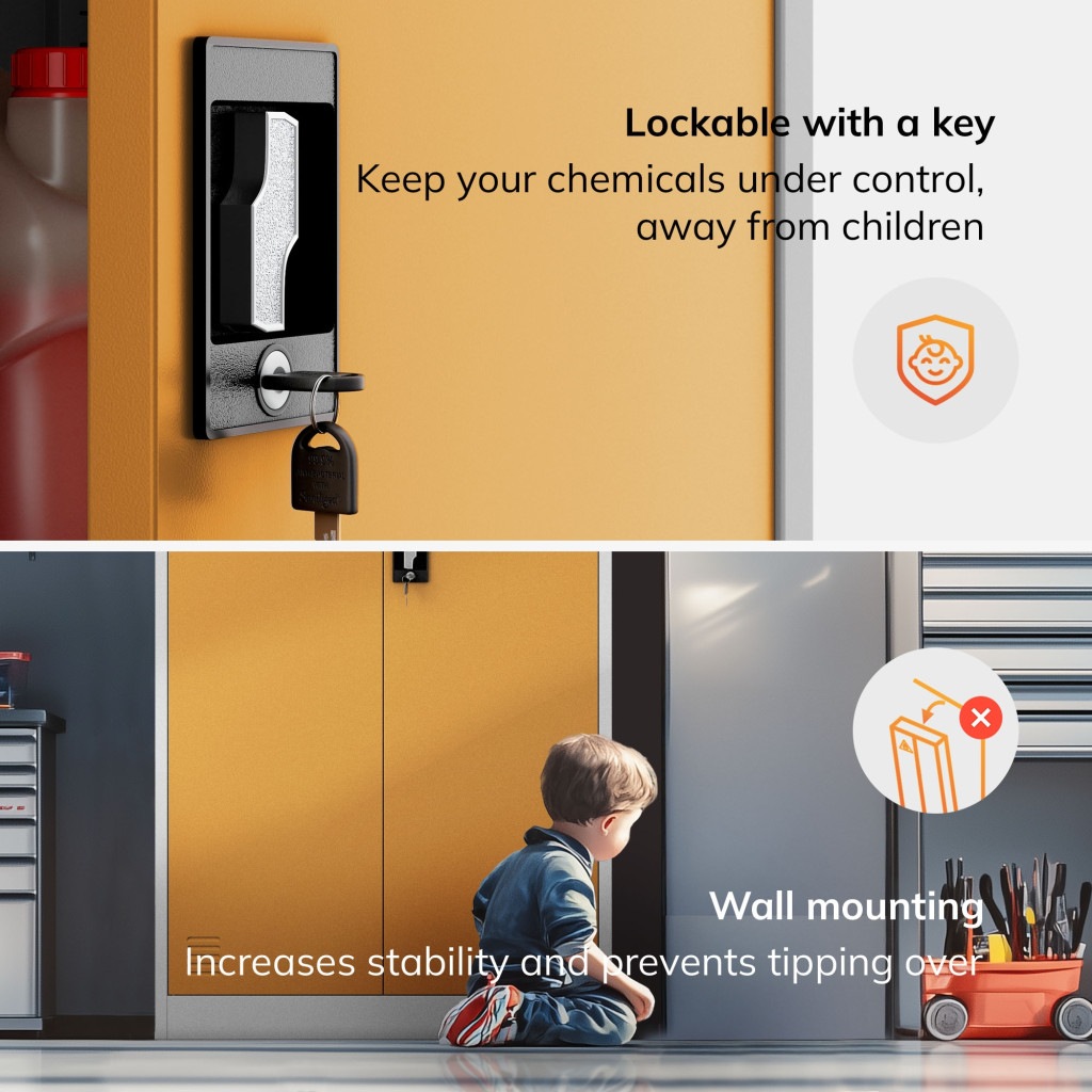 A felhasználók egészségének védelmét szolgálja az ajtókon elhelyezett perforáció is, amely folyamatos természetes szellőzést biztosít a szekrény belsejében, megakadályozva a gőzök felgyülemlését. A biztonságot tovább fokozza a 3 ponton záródó professzionális biztonsági zár, amely hatékonyan távol tartja az illetéktelen személyeket a veszélyes anyagoktól. A stabilitás növelése érdekében a szekrény speciális rögzítőszíjakkal van ellátva, amelyekkel a falhoz rögzíthető a szerkezet, így teljesen kizárható a véletlen felborulás veszélye. Az EAN 5904405579732 azonosítóval rendelkező modell így minden szempontból megfelel a szigorú tárolási követelményeknek.