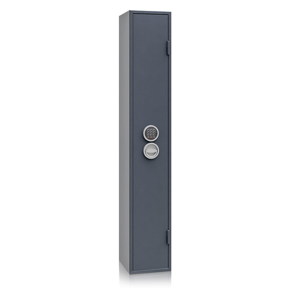 A szekrény háromirányú zárással és 25 mm-es kerek acél hevederekkel rendelkezik, így a betörés elleni védelem maximális. A zárszerkezetet mangán acéllap védi a felfúrás ellen. Az ajtó 90°-ban nyitható, erősített belső zsanérokkal, 12 mm-re kiálló, ajtóra simuló fém kilinccsel, amely elegáns és praktikus megoldás a mindennapi használatban.