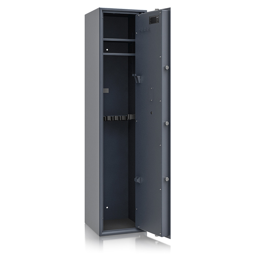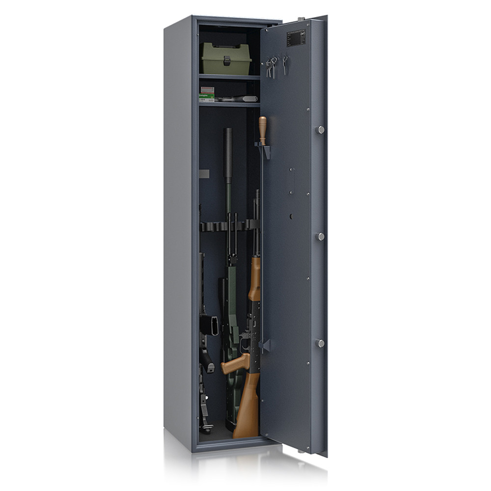 •minőségi fegyverszekrény•beépített lőszertartó nélkül•3 mm vastag, egyfalú acél test•60 mm vastag duplafalú ajtó, 3 mm-es acél borítással•12 mm-re kiálló, ajtóra simuló fém kilincs •90 fokos ajtónyitás, erősített belső zsanérokkal•háromirányú zárás, 25 mm-es kerek, acél hevederekkel•felfúrás ellen mangán acéllappal védett zárszerkezet•szivacs fegyvertartók 4, 5 vagy 7 db fegyver részére•2 db kivehető és állítható magasságú polc•ajtóra szerelt tisztítóvessző tartó és kulcsakasztó•két darab rögzítő furat lefelé és hátrafelé•alapkivitelben VdS I-es kulcsos zár, 2 db 65 mm-es kulccsal•többféle zárral, grafitszürke (RAL 7024) színben rendelhető
