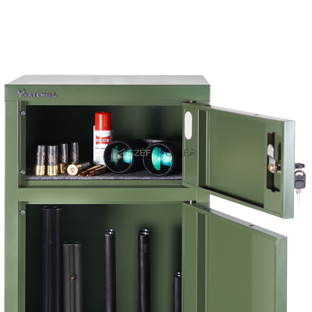 A lapra szerelt kialakításunknak köszönhetően ügyfeleink kényelmesen és kedvező áron juthatnak hozzá a kiváló minőségű fegyverszekrényeinkhez, melyek könnyen összeszerelhetők otthoni körülmények között is. Az Artemisz® Zöld Fegyvertárolók nem csak a biztonságos tárolást kínálja, hanem egy sokoldalú és megbízható megoldást jelent minden fegyvertulajdonos számára. Biztonság, minőség és megbízhatóság – ezek jellemzik legújabb fegyverszekrényünket, amelyek 5 fegyveres fegyverszekrény.