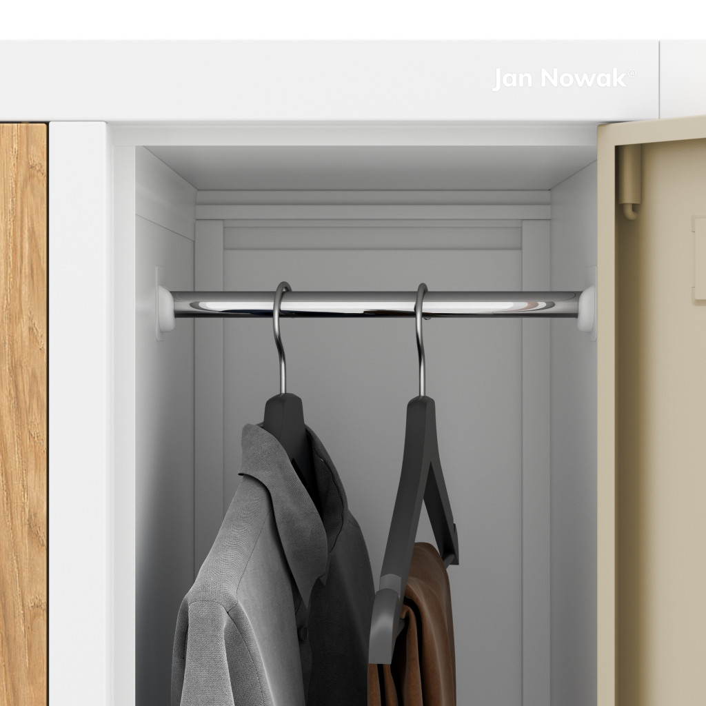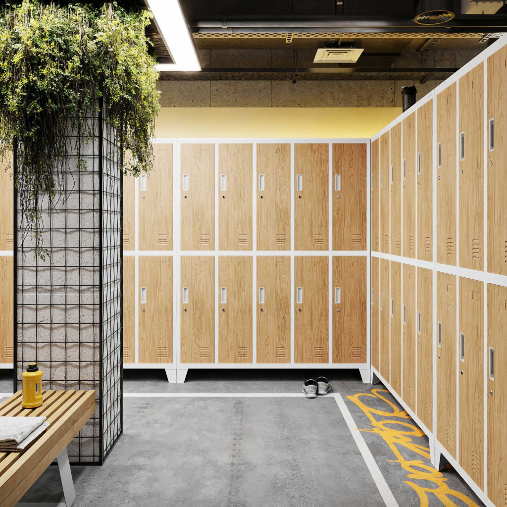 A modern megjelenést a fehér szín RAL 9003 és az arany tölgy fa hatású felület harmonikus kombinációja adja amely világosabbá és barátságosabbá teszi az öltözőhelyiséget miközben professzionális összhatást nyújt