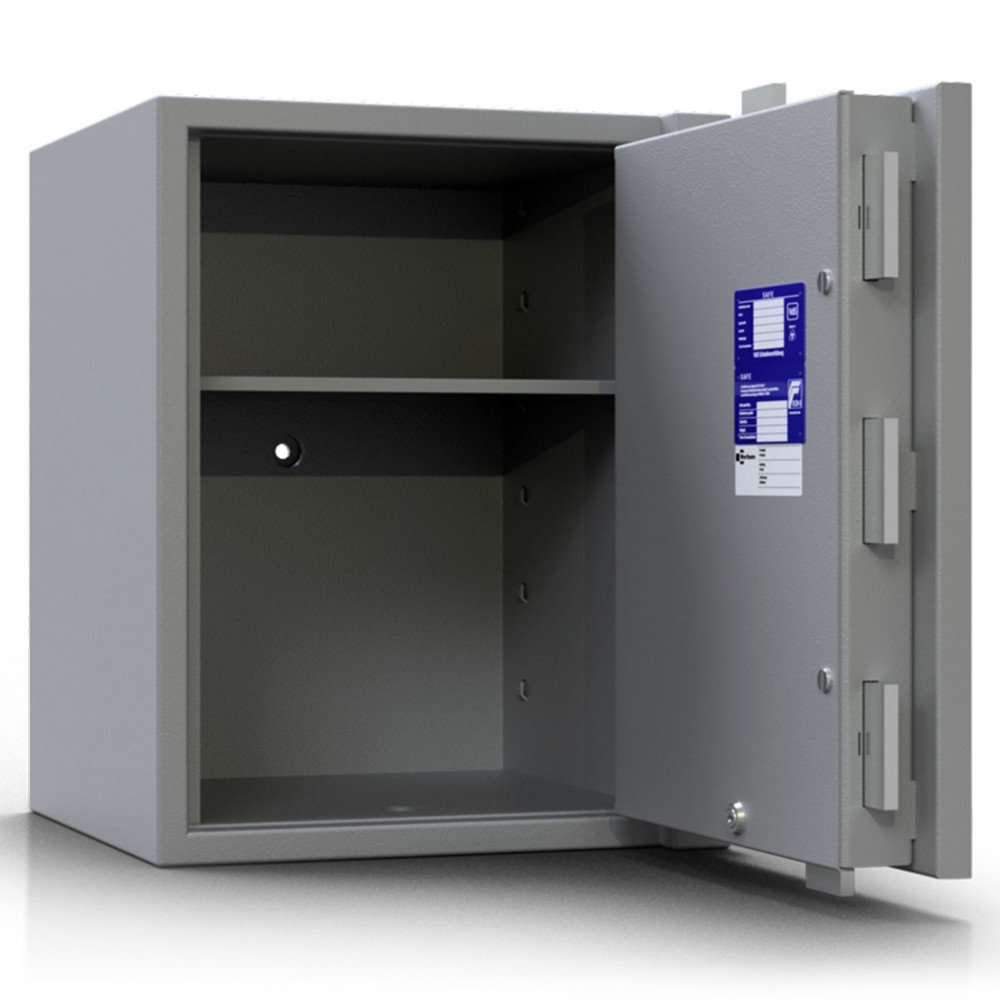 • DIN 4102 szerinti tűzálló szigetelés• többrétegű acél test (vékonyított a maximális térfogatért)• 80 mm vastag, többrétegű acél ajtó (szervizkulcsos)• 25 mm-es speciálisan megerősített beton töltet a testben és az ajtóban (lángvágás és flexelés ellen)• 25 mm-re kiemelkedő csillag alakú kilincs és zsanér• 180 fokos ajtónyitás, erős külső zsanérokkal• testbe forduló ajtó (zsanérlevágás ellen)• háromirányú zárás tömör acél hevederekkel• rozsdamentes belső szerkezet és kilincsmű (werk)• mangán acéllappal védett zárszerkezet (fúrás ellen)• rugós, műanyag huzalos passzív zár (felfúrásra, átvágásra és zárbeütésre is aktiválódik)• huzal elszakadása után a páncélszekrény nem nyitható• kisebb tüzek elleni védelem a testben és az ajtóban• kivehető és állítható magasságú polc(ok)• 14 mm-es rögzítő furat lefelé és hátrafelé• alapkivitelben középszürke (RAL 7037) színben• többféle zárral, jobbos és balos ajtónyitással is rendelhető• prémium kategóriájú páncélszekrény igényeseknek