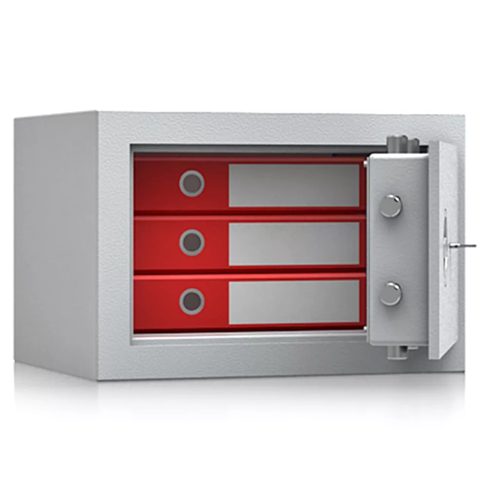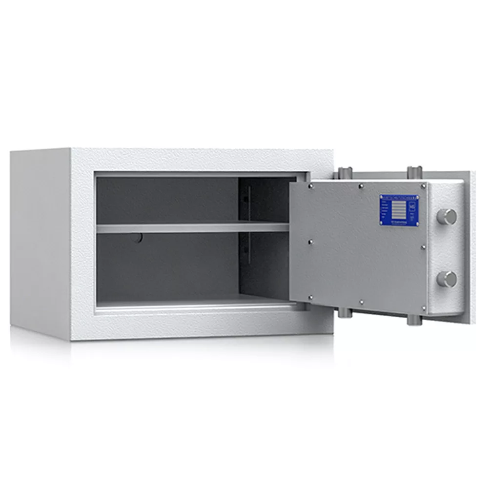 • négyrétegű kompakt acél test az optimális védelemért• 85 mm vastag, háromrétegű ajtó, 12 mm-es acél borítással• 90 fokos ajtónyitás rejtett zsanérokkal• négyirányú zárás, 25 mm-es kerek, acél hevederekkel• felfúrás ellen mangán acéllappal védett zárszerkezet• süllyesztett fém kilincs• állítható magasságú polcok• két rögzítő furat lefelé• világosszürke (RAL 7035) szín