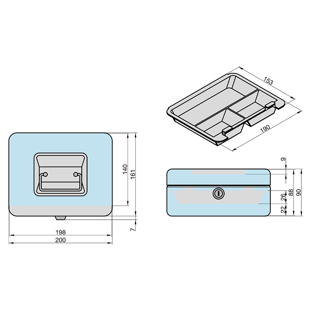 •acéllemez pénzkazetta•süllyesztett fém fogantyú•3 rekeszes műanyag aprópénztartó•alatta hely bankjegyeknek•krómozott lamellás zár•kettő darab kulccsal•többféle méretben és színben áruljuk