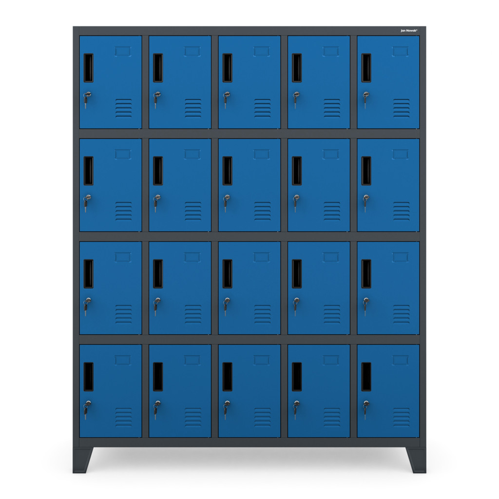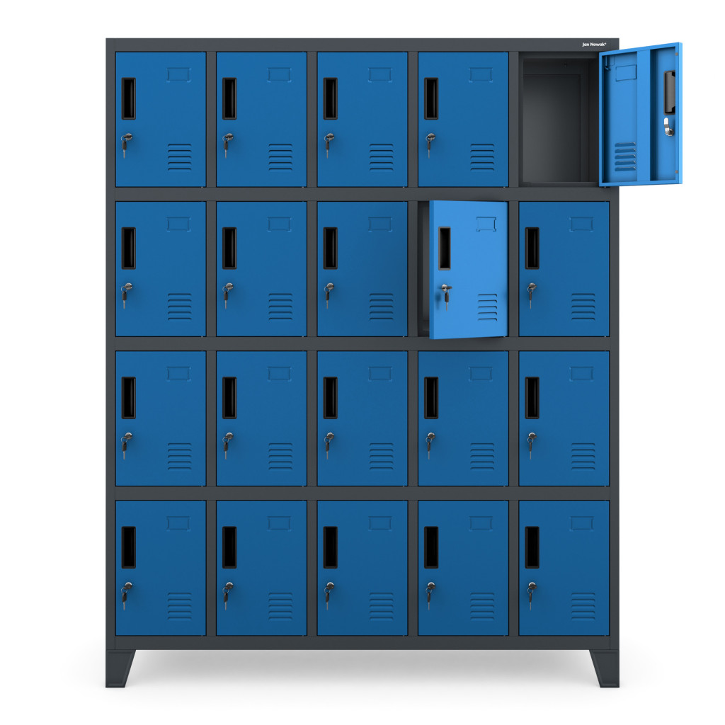 A Jan Nowak ROBERT fém öltözőszekrény ideális választás olyan öltözőkbe és közösségi helyiségekbe, ahol fontos a rendezett, biztonságos és helytakarékos tárolás. A kompakt kialakítású, antracit-kék színű modell összesen 20 különálló rekesszel rendelkezik, így egyszerre több felhasználó számára is kényelmes megoldást biztosít. Kiválóan alkalmazható munkahelyi öltözőkben, iskolákban, edzőtermekben, sportlétesítményekben és különféle szolgáltatóegységekben is.