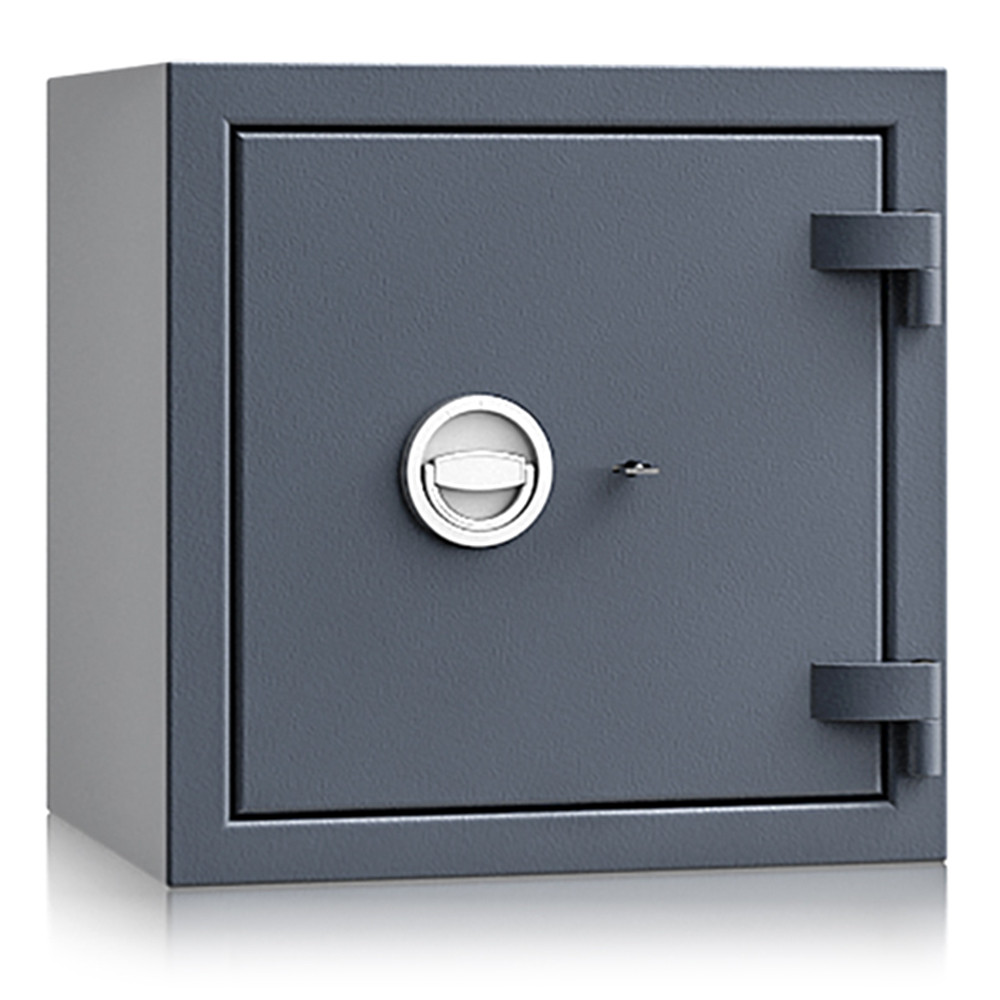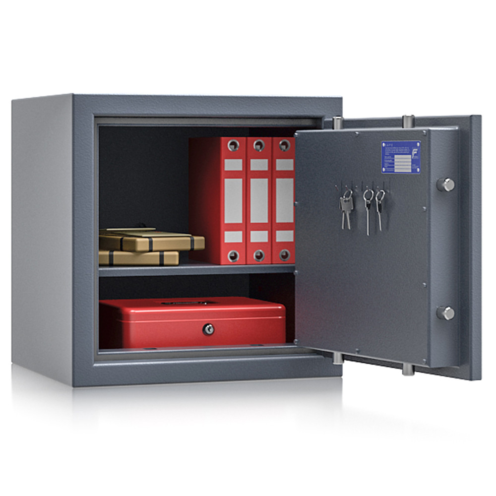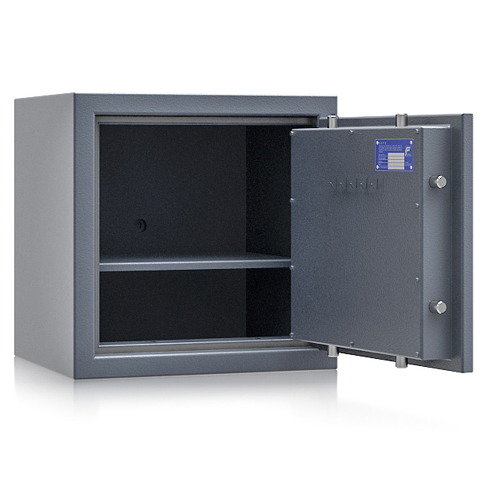 • MSZ EN 1143-1 szerinti EU 1 ellenállási fokozat• 25 mm vastag, többrétegű acél test• 84 mm vastag, többrétegű acél ajtó• 12 mm-re kiálló, ajtóra simuló fém kilincs• 180 fokos ajtónyitás, erős külső zsanérokkal• háromirányú zárás, 25 mm-es kerek, acél hevederekkel• erős rögzítő rudak a zsanéroldalon (zsanérlevágás ellen)• felfúrás ellen mangán acéllappal védett zárszerkezet• kivehető és állítható magasságú polc(ok)• 14 mm-es rögzítő furat lefelé és hátrafelé• alapkivitelben VdS I-es kulcsos zár, 2 db 95 mm-es kulccsal• többféle zárral, grafitszürke (RAL 7024) színben rendelhető