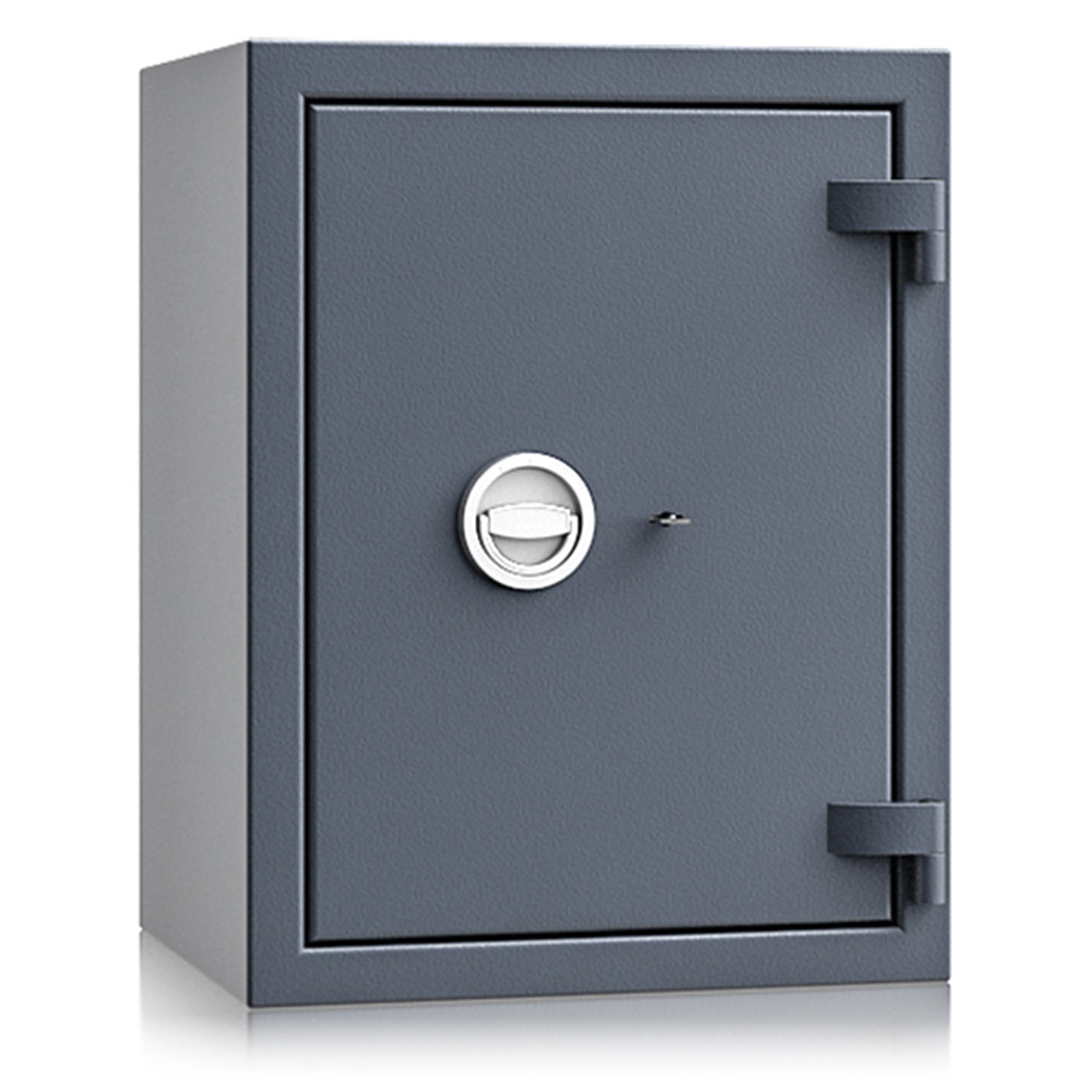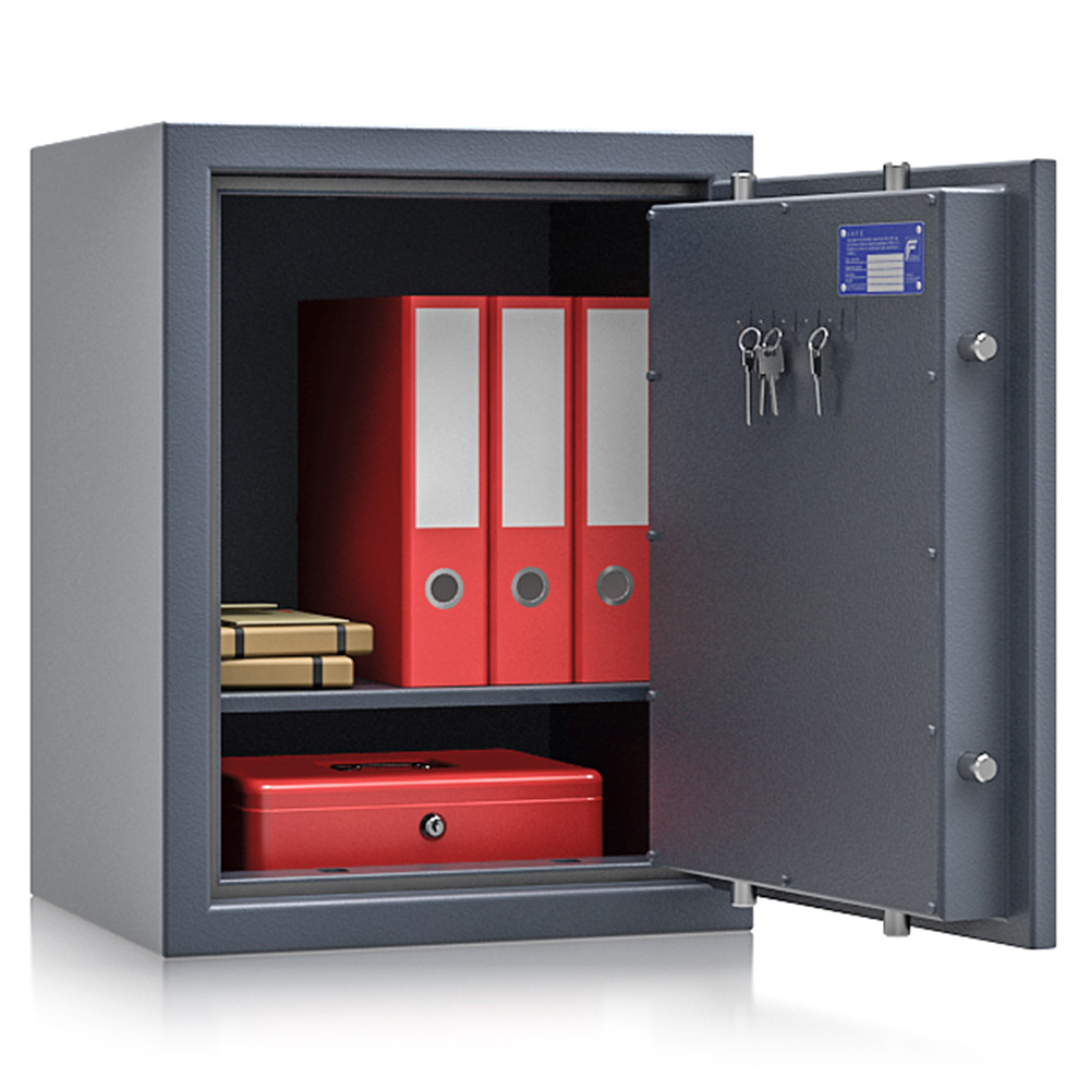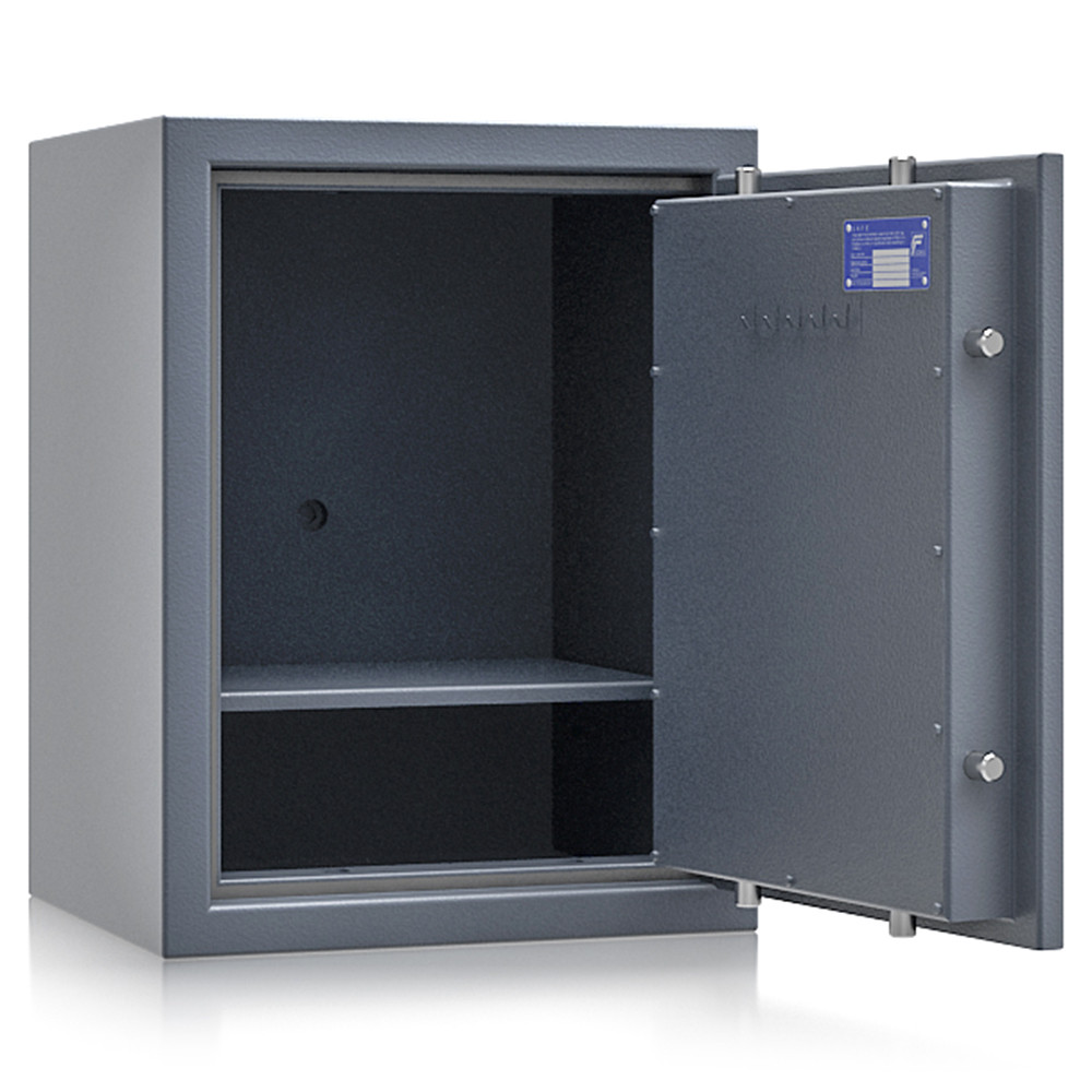 • MSZ EN 1143-1 szerinti EU 1 ellenállási fokozat• 25 mm vastag, többrétegű acél test• 84 mm vastag, többrétegű acél ajtó• 12 mm-re kiálló, ajtóra simuló fém kilincs• 180 fokos ajtónyitás, erős külső zsanérokkal• háromirányú zárás, 25 mm-es kerek, acél hevederekkel• erős rögzítő rudak a zsanéroldalon (zsanérlevágás ellen)• felfúrás ellen mangán acéllappal védett zárszerkezet• kivehető és állítható magasságú polc(ok)• 14 mm-es rögzítő furat lefelé és hátrafelé• alapkivitelben VdS I-es kulcsos zár, 2 db 95 mm-es kulccsal• többféle zárral, grafitszürke (RAL 7024) színben rendelhető