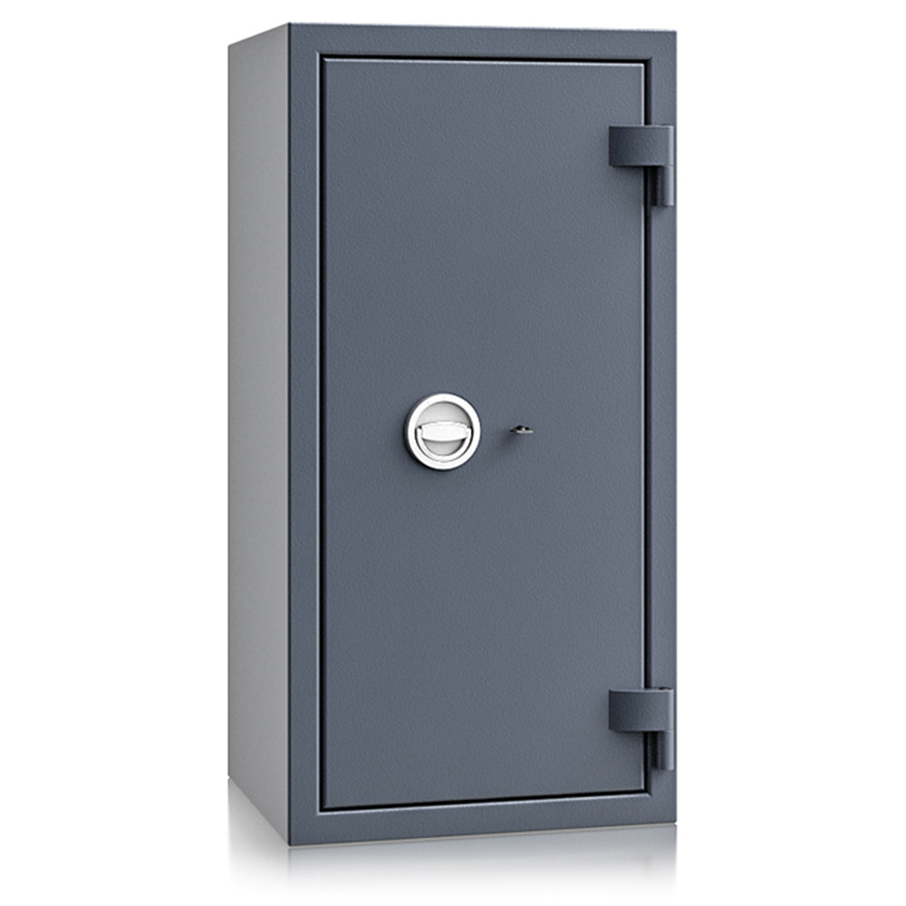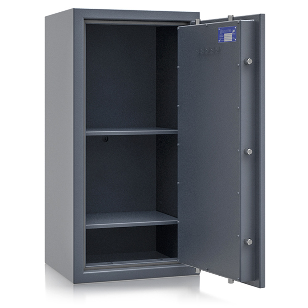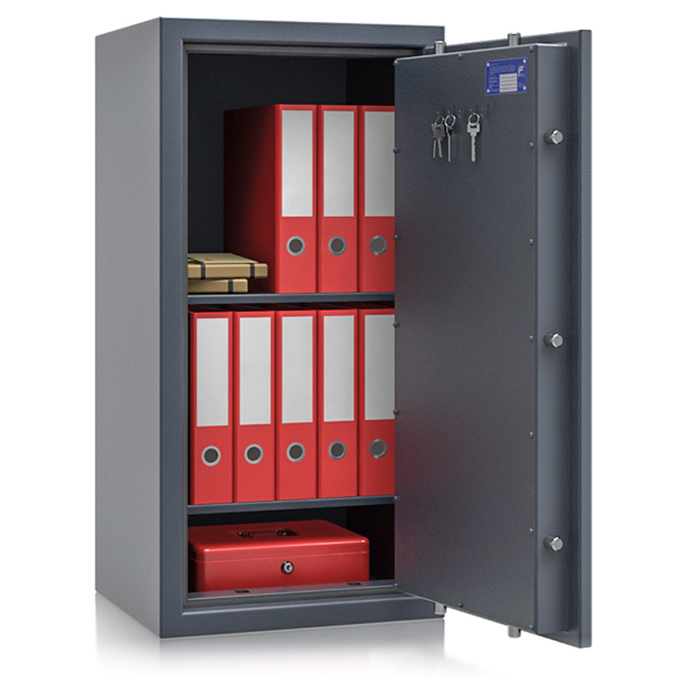 • MSZ EN 1143-1 szerinti EU 1 ellenállási fokozat• 25 mm vastag, többrétegű acél test• 84 mm vastag, többrétegű acél ajtó• 12 mm-re kiálló, ajtóra simuló fém kilincs• 180 fokos ajtónyitás, erős külső zsanérokkal• háromirányú zárás, 25 mm-es kerek, acél hevederekkel• erős rögzítő rudak a zsanéroldalon (zsanérlevágás ellen)• felfúrás ellen mangán acéllappal védett zárszerkezet• kivehető és állítható magasságú polc(ok)• 14 mm-es rögzítő furat lefelé és hátrafelé• alapkivitelben VdS I-es kulcsos zár, 2 db 95 mm-es kulccsal• többféle zárral, grafitszürke (RAL 7024) színben rendelhető