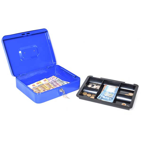 Extra Tulajdonságok: Az acéllemez pénzkazetták rejtett belső zsanérozással rendelkeznek, négyszögletes formájuk lekerekített élekkel büszkélkedik, és süllyesztett fém fogantyújuk könnyű szállítást tesz lehetővé. A pénzkazettákban megtalálható a kivehető műanyag aprópénztartó, valamint alatta hely van a bankjegyeknek. A krómozott lamellás zárak megbízható védelmet nyújtanak, és kettő darab kulccsal szállítjuk őket.