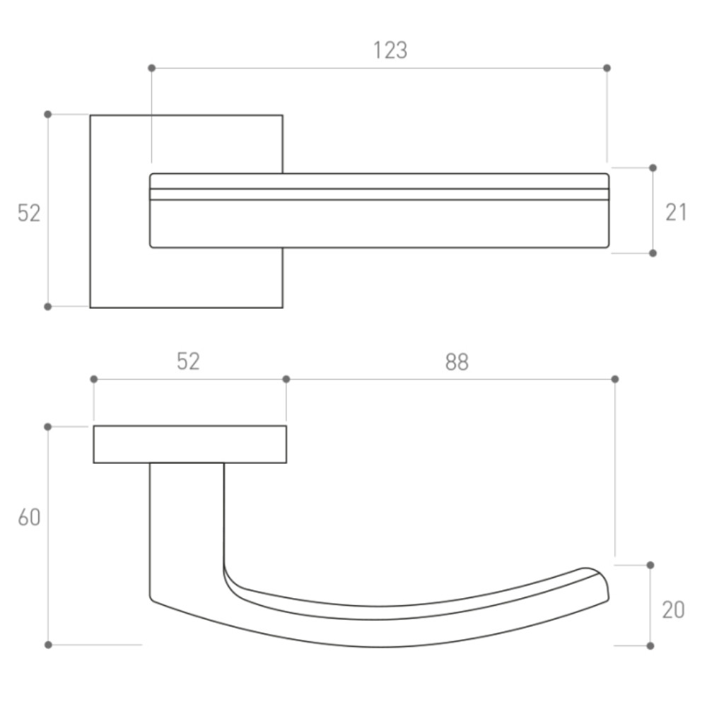 •alumínium ajtókilincs•modern beltéri ajtókhoz•elegánsan ívelt kilincs •szögletes rozetta forma•mindkét oldalon rugós mechanizmussal•kilincs lenyomás után visszaáll vízszintes helyzetbe•105 mm hosszú, 8 x 8 mm-es kilincs tengely•70 mm hosszú (méretre vágható) rögzítő csavar•zártakaró rozetta küldöm kapható•felszereléshez szükséges anyagokkal•többféle színben áruljuk•kilincs hossz: 123 mm•rozetta méret: 52 x 52 mm