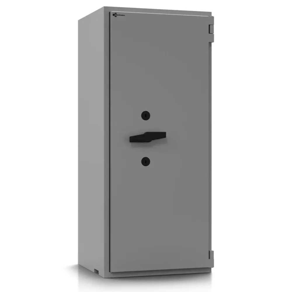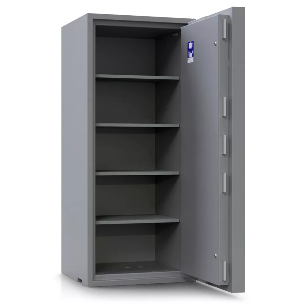 • 80mm vastag acél test, speciálisan megerősített beton töltettel (maximális védelem lángvágás és flexelés ellen)• 160mm vastag acél ajtó (ebből 70mm extra erős beton)• 60mm-re kiemelkedő elegáns alumínium kilincs• 180 fokos ajtónyitás, erős külső zsanérokkal• rögzítő fülek a zsanéroldalon (zsanérlevágás ellen)• háromirányú zárás acél hevederekkel (16x120mm)• ipari gyémánt bevonat az összes hevederen• rozsdamentes belső szerkezet és kilincsmű (werk)• mangán acéllappal védett zárszerkezet (fúrás ellen)• nagyméretű, üveglapos passzív zár (ütésre, felfúrásra, átvágásra és zárbeütésre is aktiválódik)• üveg berobbanása után a páncélszekrény nem nyitható• hátsó és oldalsó kábelátvezető furat (riasztókábelnek)• felfogató lap rezgésérzékelőnek (testen és az ajtón is)• 22mm-es rögzítő furat lefelé (műanyag kupakkal)• kivehető és állítható magasságú polc(ok)• világosszürke (RAL 7035) színben (kétszínű ajtóval)• többféle zárkombinációval és kiegészítővel is rendelhető• prémium kategóriájú páncélszekrény igényeseknek