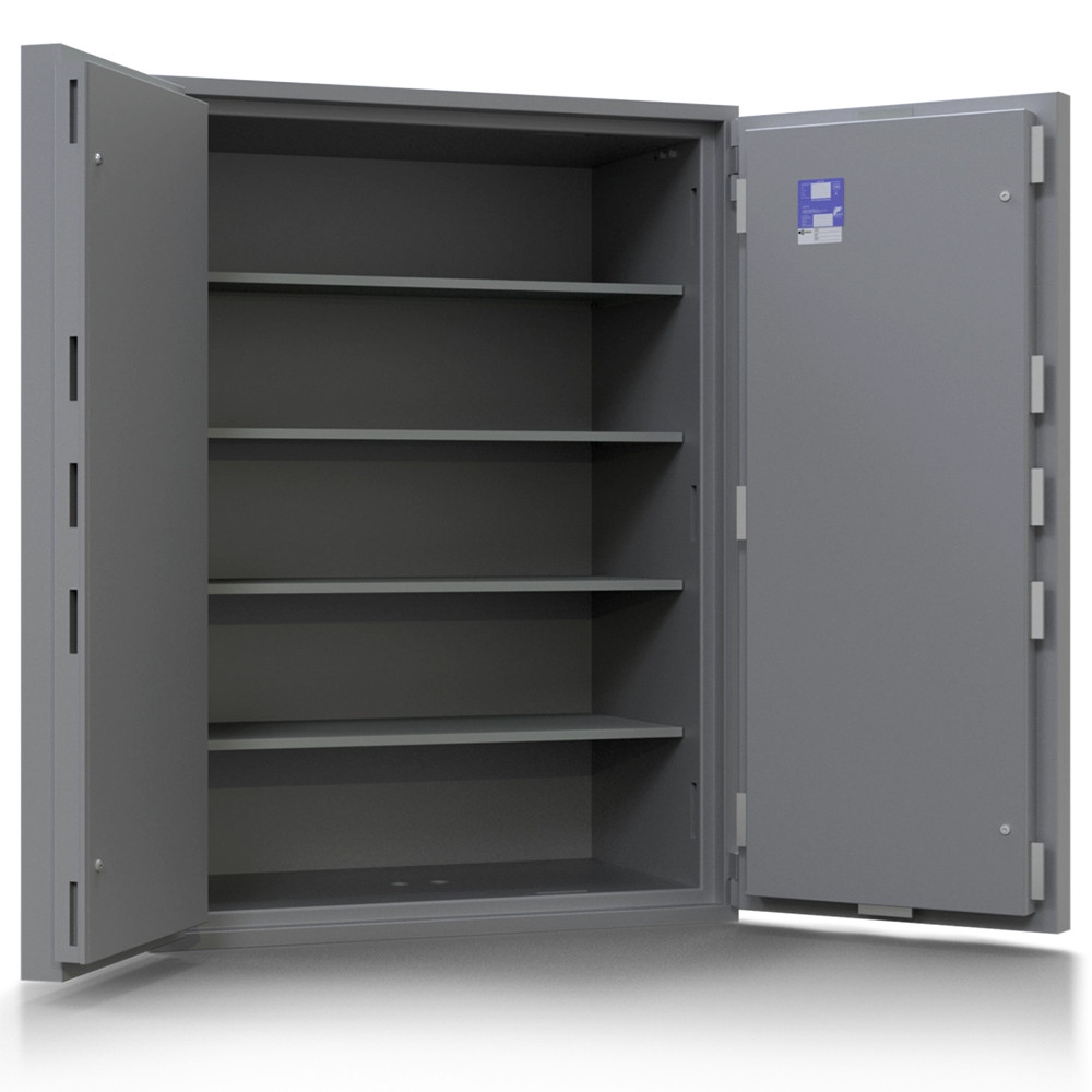 • 80mm vastag acél test, speciálisan megerősített beton töltettel (maximális védelem lángvágás és flexelés ellen)• 160mm vastag acél ajtó (ebből 70mm extra erős beton)• 60mm-re kiemelkedő elegáns alumínium kilincs• 180 fokos ajtónyitás, erős külső zsanérokkal• rögzítő fülek a zsanéroldalon (zsanérlevágás ellen)• háromirányú zárás acél hevederekkel (16x120mm)• ipari gyémánt bevonat az összes hevederen• rozsdamentes belső szerkezet és kilincsmű (werk)• mangán acéllappal védett zárszerkezet (fúrás ellen)• nagyméretű, üveglapos passzív zár (ütésre, felfúrásra, átvágásra és zárbeütésre is aktiválódik)• üveg berobbanása után a páncélszekrény nem nyitható• hátsó és oldalsó kábelátvezető furat (riasztókábelnek)• felfogató lap rezgésérzékelőnek (testen és az ajtón is)• 22mm-es rögzítő furat lefelé (műanyag kupakkal)• kivehető és állítható magasságú polc(ok)• világosszürke (RAL 7035) színben (kétszínű ajtóval)• többféle zárkombinációval és kiegészítővel is rendelhető• prémium kategóriájú páncélszekrény igényeseknek