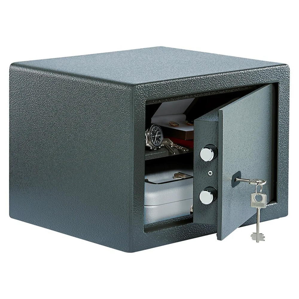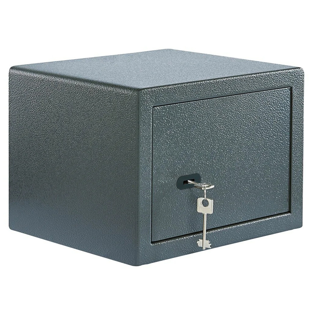•megbízható bútorszéf kulcsos zárral•2 mm-es egyfalú acél test•48 mm vastag ajtó, 6 mm-es acél borítással•90 fokos ajtónyitás jobboldali zsanérokkal•egyirányú zárás 22 mm-es acél hevederekkel•Secu 6 lamellás duplatollú biztonsági zár•15.000 feletti zárási variációval•kettő darab 76 mm-es kulccsal•rögzítő furat lefelé és hátrafelé•nyerskulcs típusa: Rohling 17C