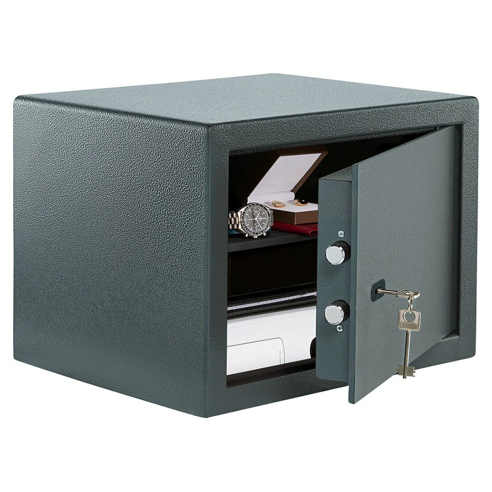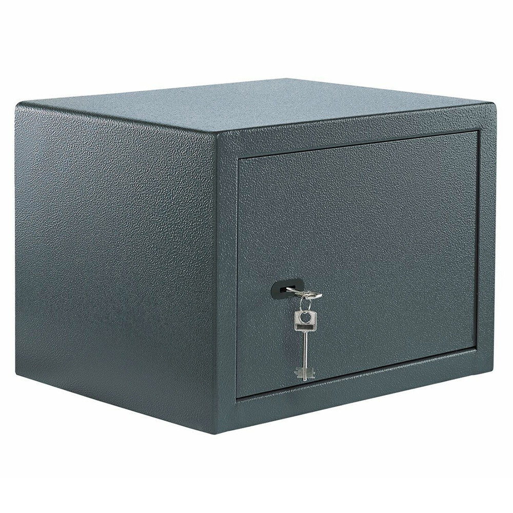 •megbízható bútorszéf kulcsos zárral•2 mm-es egyfalú acél test•48 mm vastag ajtó, 6 mm-es acél borítással•90 fokos ajtónyitás jobboldali zsanérokkal•egyirányú zárás 22 mm-es acél hevederekkel•Secu 6 lamellás duplatollú biztonsági zár•15.000 feletti zárási variációval•kettő darab 76 mm-es kulccsal•rögzítő furat lefelé és hátrafelé•nyerskulcs típusa: Rohling 17C
