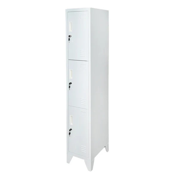3 rekeszes fémszekrény kompakt és biztonságos tárolási megoldást kínál öltözőkbe, műhelyekbe, iskolákba vagy munkahelyi szociális helyiségekbe. A keskeny kialakítás kis helyigény mellett három külön zárható rekeszt biztosít, így több felhasználó számára is ideális. A lábas kivitel megkönnyíti a takarítást a szekrény alatt, valamint javítja a szellőzést.