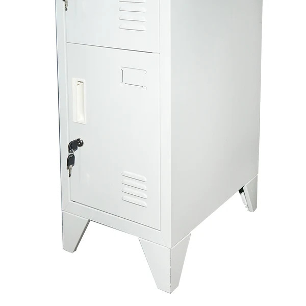 A szekrény 1700 x 300 x 450 mm méretű, ami helytakarékos elhelyezést biztosít. A 4 különálló biztonsági ajtó kulccsal zárható, így a tárolt tárgyak védelme biztosított. Az ajtók címketartóval felszereltek, ami segíti az egyértelmű azonosítást. A szellőzőnyílásokkal ellátott ajtók megfelelő légáramlást biztosítanak, csökkentve a párásodás és a kellemetlen szagok kialakulását.