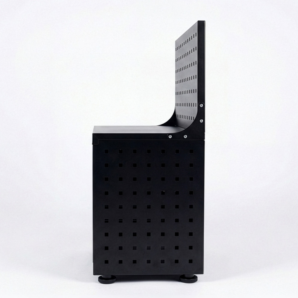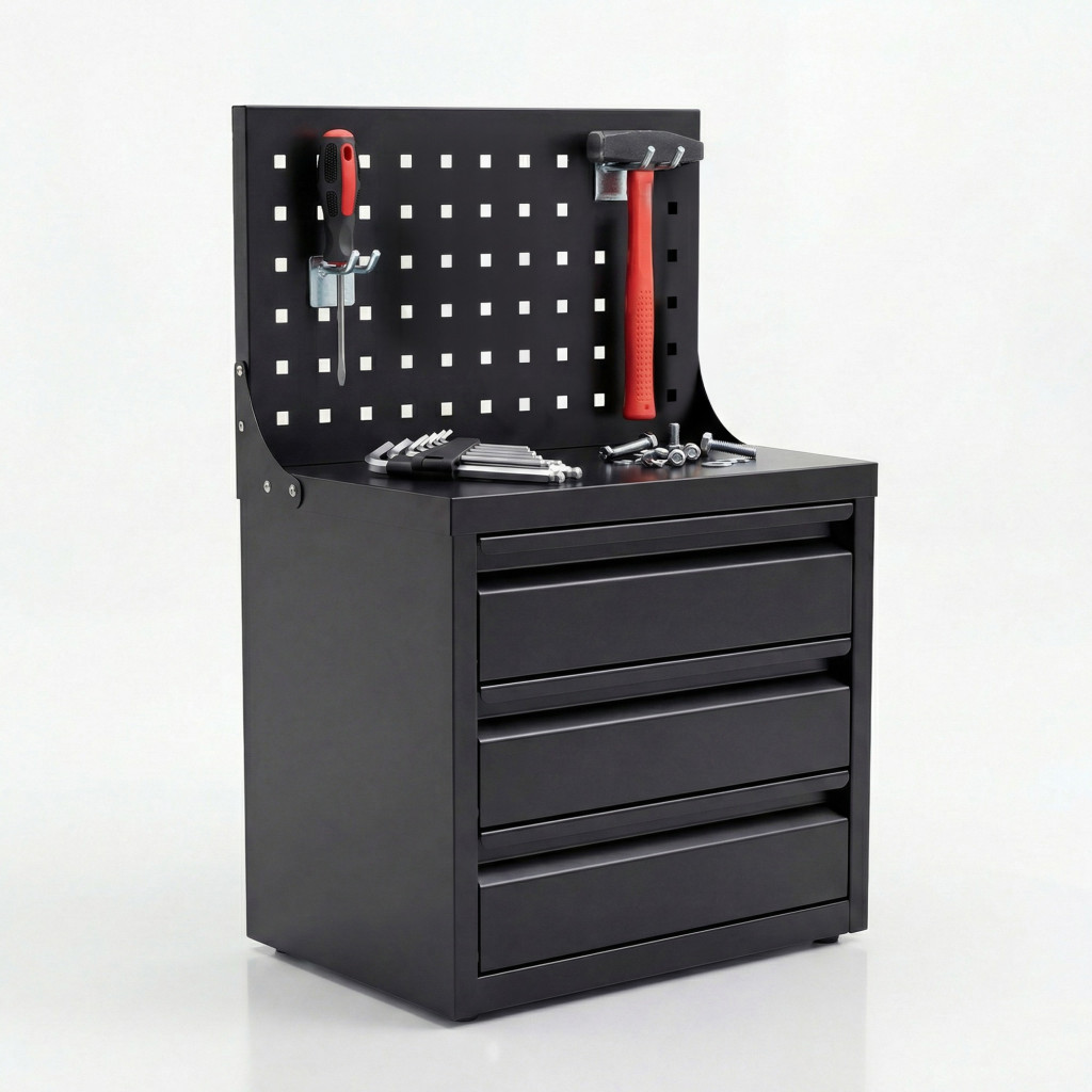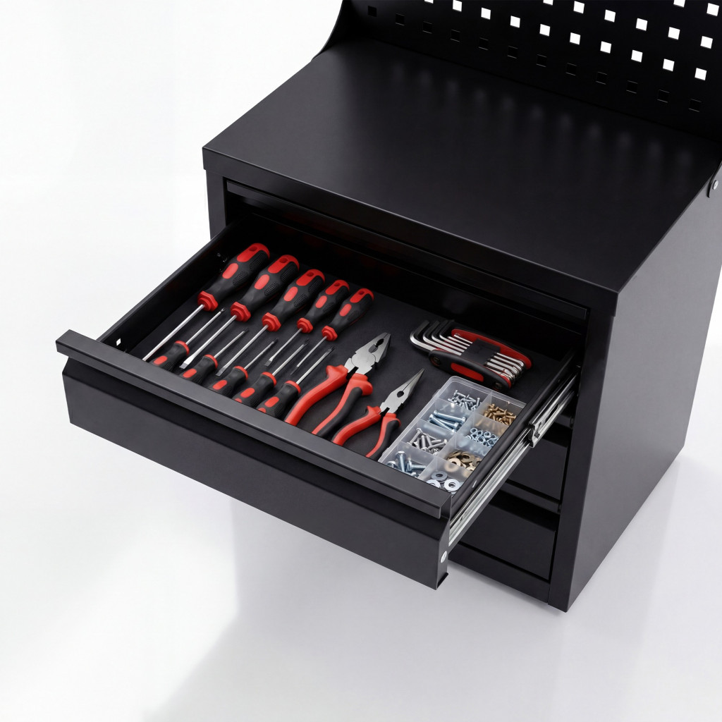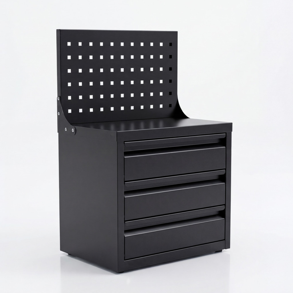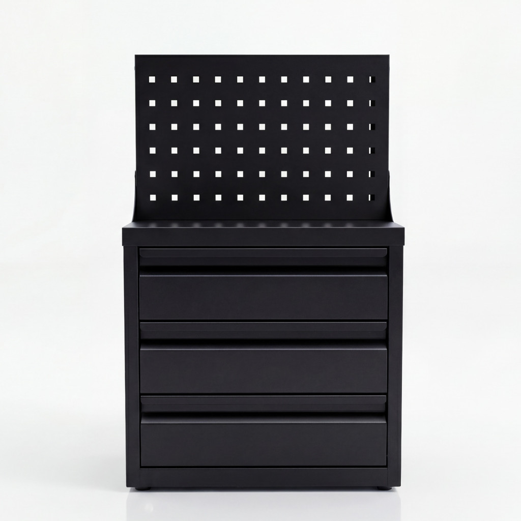 Méret: 660 x 400 x 300 mm. Anyag: 0,6 mm porfestett szénacél. Fiókok száma: 3 db. Teherbírás: 30 kg / fiók. Kivitel: önálló, oldalsó perforált panellel. Kiegészítés: opcionális perforált tábla. Lábak: szintező lábak, 10 mm állítási tartománnyal. Szín: fekete. EAN: 5907367504606.